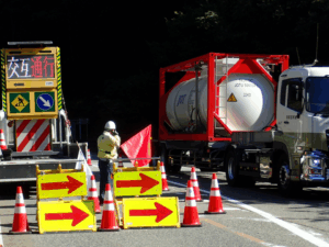 この現場で、ベテラン警備員は、見通しの悪いカーブ方向を担当し、工事を行っている規制帯側を新人女性警備員が担当しました。