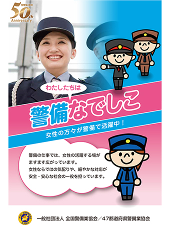 上記のポスターは、全国警備業協会で女性警備員の採用者数増加、定着率向上、活躍推進に向けた認知度向上のためのシンボル的役割を期待して、平成29年に女性警備員の愛称を「警備なでしこ」として制定され紹介されました。