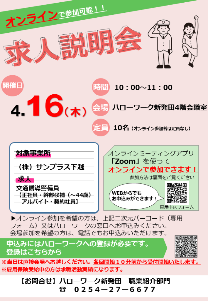 4月16日(木)10:00から、ハローワーク新発田において、交通誘導警備員の求人説明会を行います。