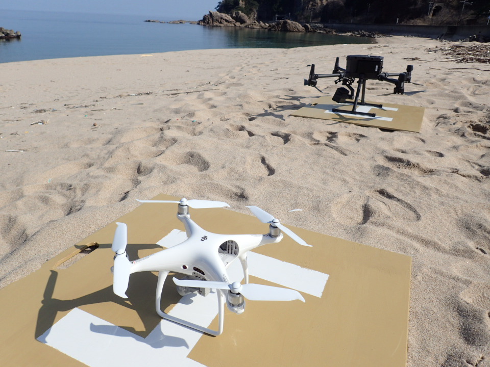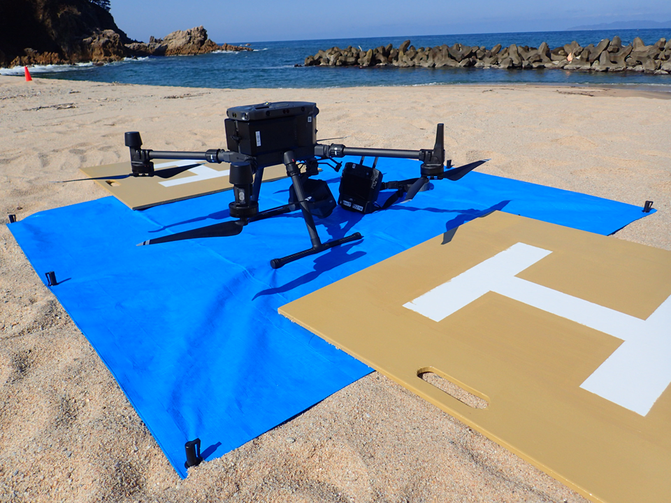特に、乾燥した砂浜では、プロペラが回転すると多くの砂を巻き上げてしまうため、機材を保護するために機体より大きな範囲をブルーシートで固定して離発着場(写真下)を準備することもあります。シートを敷いても少し風が吹くと、シートの上に砂が乗ってくるので、手ごわいですね・・・