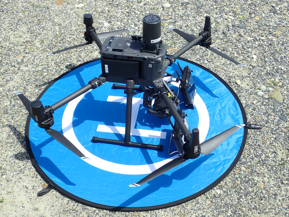 ドローンは、ヘリコプター(回転翼航空機)と同じで、離着陸をする時に、プロペラを回転させて揚力を得ているため、空気が下に吹きおろされます。地表面にある石などの異物が飛散しやすい場所では、上にあるような離発着シートを使用して、異物が飛散するのを防止しています。