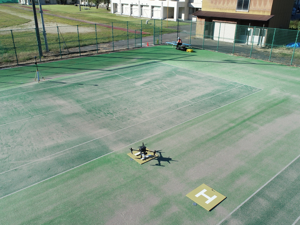 周囲がフェンスに囲まれた離発着場(写真下:テニスコート)では、第3者が立ち入ることはありませんが、表面に砂があったため、離発着板を使用しました。MTRICE300RTKでは、ブルーシートを杭で固定することができないため、やや小さめでしたが多少の効果はありました。