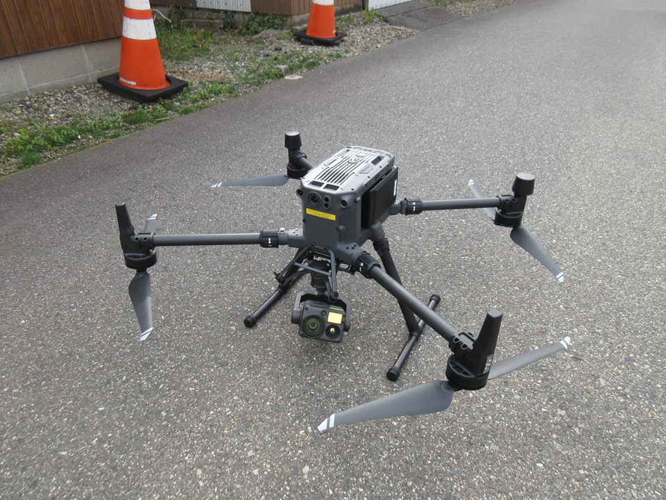 下の写真は、アスファルトの上に置いたドローンです。駐車場(会社の敷地)の入り口に、人員を配置して立入管理区域(立入禁止)を設定したので、「H」表示を使用しないこともあります。