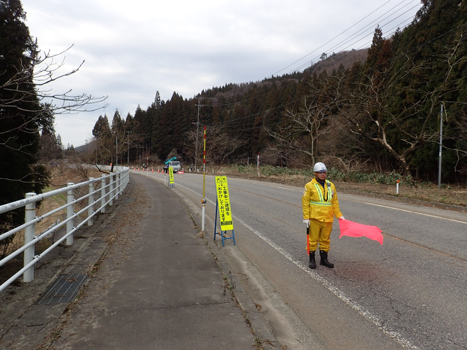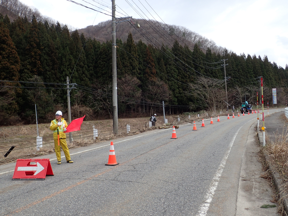 今回は、道路沿いの立木の伐採に伴う片側交互通行の様子を紹介します。