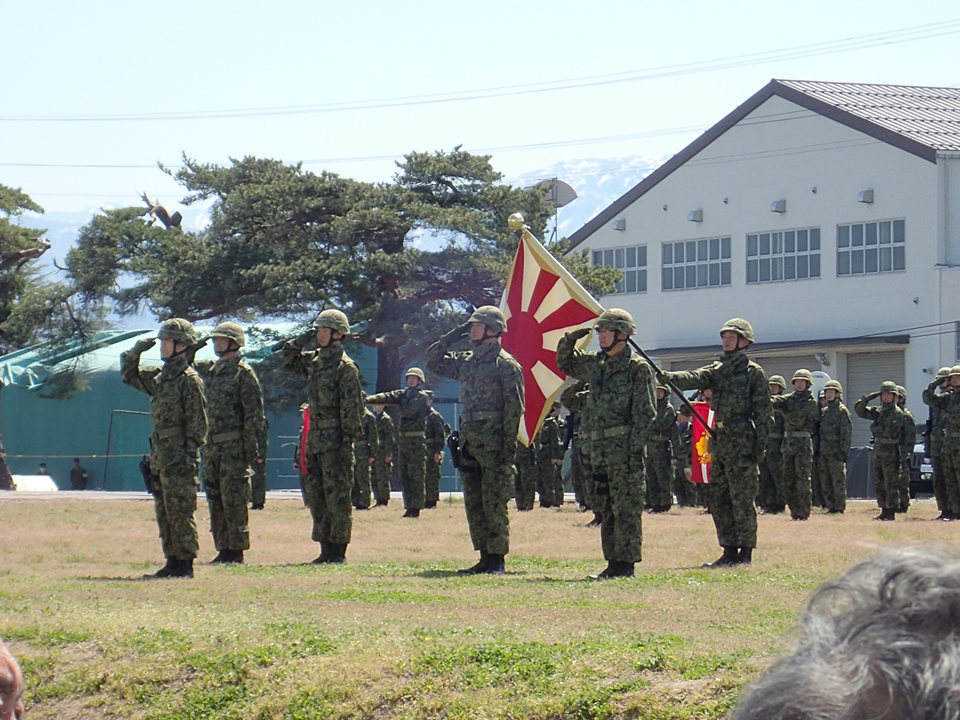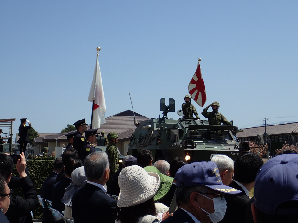 今日は、交通誘導やドローンの話題ではなく、4月26日(日)新発田駐屯地開設73周年記念及び第30普通科連隊創隊64周年記念行事に招待を受け出席してきたときの写真を紹介させていただきます。(写真上:執行官に敬礼をする観閲部隊)