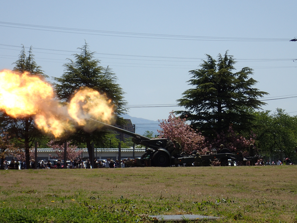 (写真下)空包射撃をする155mmけん引砲のFH-70(エフエイチナナマル)です。装備するのは、第12旅団の隷下部隊で、栃木県宇都宮市にある宇都宮駐屯地に駐屯する第12特科隊です。