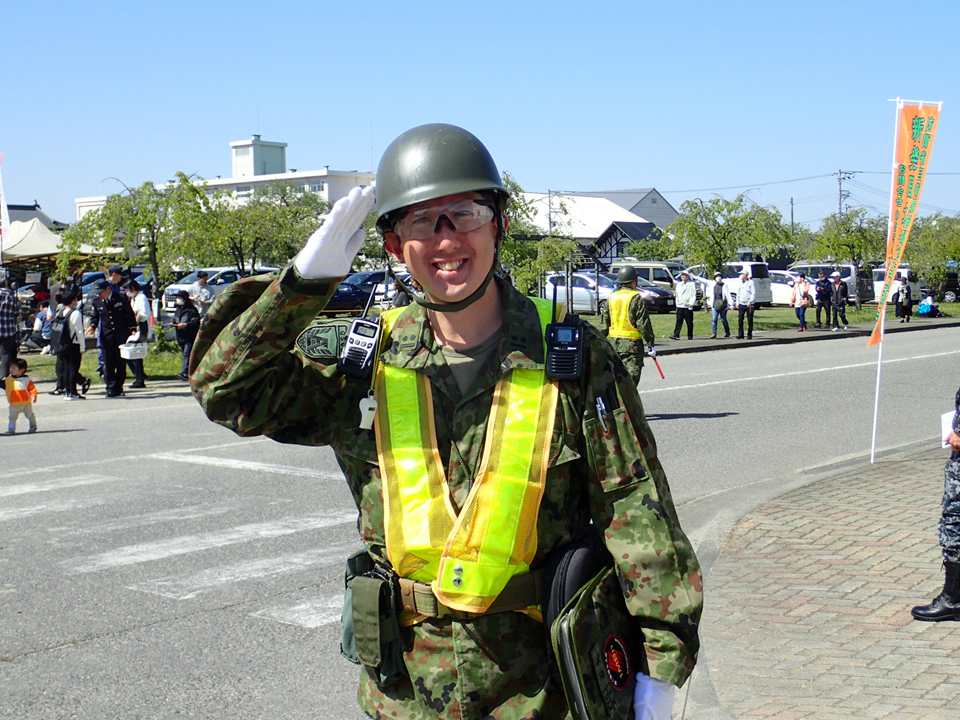 (写真下)駐屯地内で車両の誘導を行っていた自衛官です。笑顔がさわやかですね!(写真投稿は本人の了解を得ています)